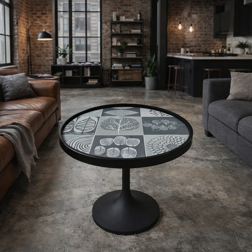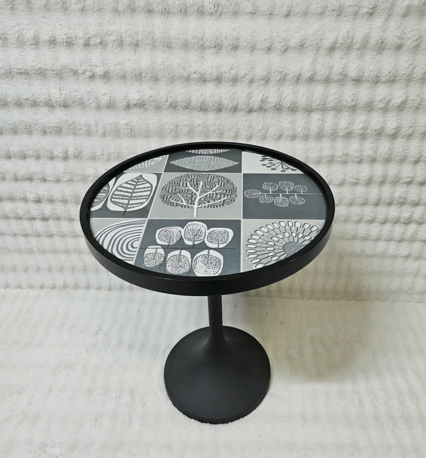 Apportez une touche élégante et contemporaine à votre intérieur avec la table d’appoint Taco Nairobi – N°06. Son plateau rond de 46 cm de diamètre présente un motif graphique noir et gris aux inspirations végétales, idéal pour sublimer un salon, une chambre ou un coin lecture avec une signature décorative moderne.
